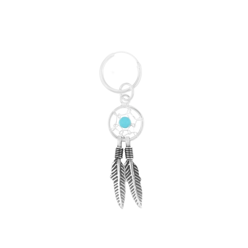 Esta pieza se compone de un aro de 12mm con atrapasueños compuesto por dos plumas y una piedra turquesa.